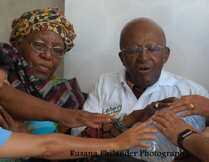 Archbishop Desmond Tutu (in white shirt) prays for a bottle of water