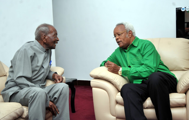 Edward Ngoyai Lowassa (R), discusses a point with one of his supporters, CCM party stalwart Kingunge Ngombale Mwiru. Internet File Photo.