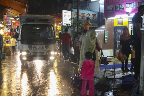 Police drive though Little Africa in Guangzhou.