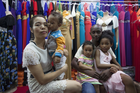 A trader with her Afro-Chinese daughters at the Tang Qi Arcade, in Guangyuan Xi Lu