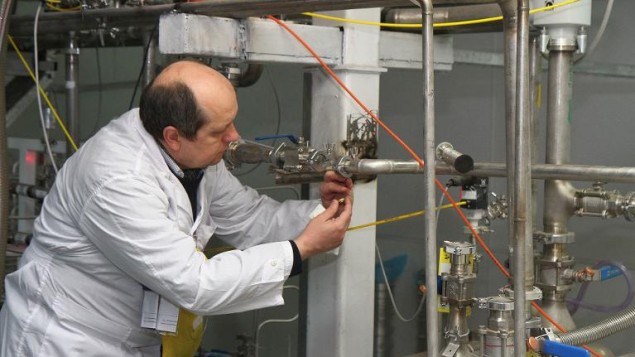 An International Atomic Energy Agency inspector disconnects the connections between the twin cascades for 20% uranium production at Natanz nuclear power plant south of Tehran on January, 20, 2014 (Photo credit: Kazem Ghane/IRNA/AFP)