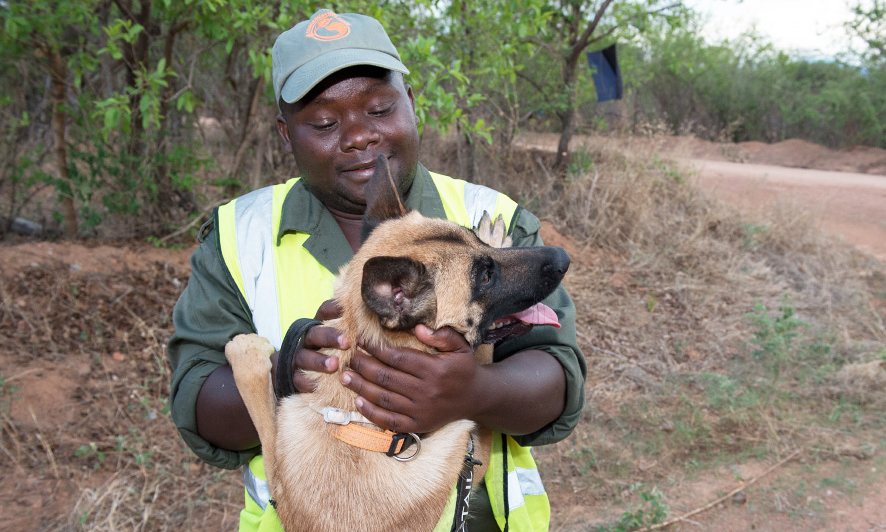 Tanzanian officers with Jenny, left, a Belgian Malinois, and Dexter, an English springer spaniel. Photograph: Julie Larsen Maher/Wildlife Conservation Society