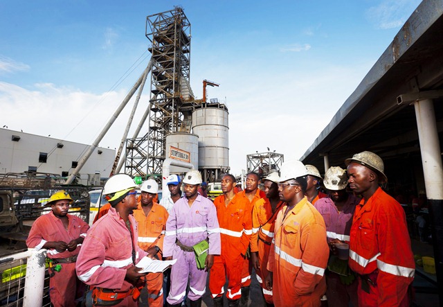 Workers assemble at Bulyanhulu Gold Mine in Shinyanga region. The mine is one of several ACACIA Gold Mining Corporation mines–formerly the Canadian London listed African Barrick Gold Mining Corp.