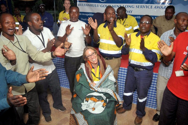 ‘CELEBRATING THE BEST MOTHER IN THE VILLAGE’: Bulyanhulu Goldmine workers chant praises to Michelle Ash (seated draped in Kitenge cloth), the Mine’s General Manager, on April 28, 2015, after awarding her a Best Manager Award to the manager they placed in authority themselves. Photos: ACACIA Gold Mining Corp.
