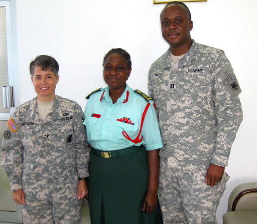 U.S. Army Africa's Col. Frances Hardison (left) and Capt. Christian Smith (right) meet with Tanzanian Peoples Defense Force Brig. Gen. Sara Rwambali (center) to discuss an upcoming gender integration seminar. Rwambali is the director of TPFD Social Affairs. TPDF personnel will co-host the seminar that will bring together leading experts in the area of integrating women in the armed forces throughout Africa. (U.S. Army Africa photo.)